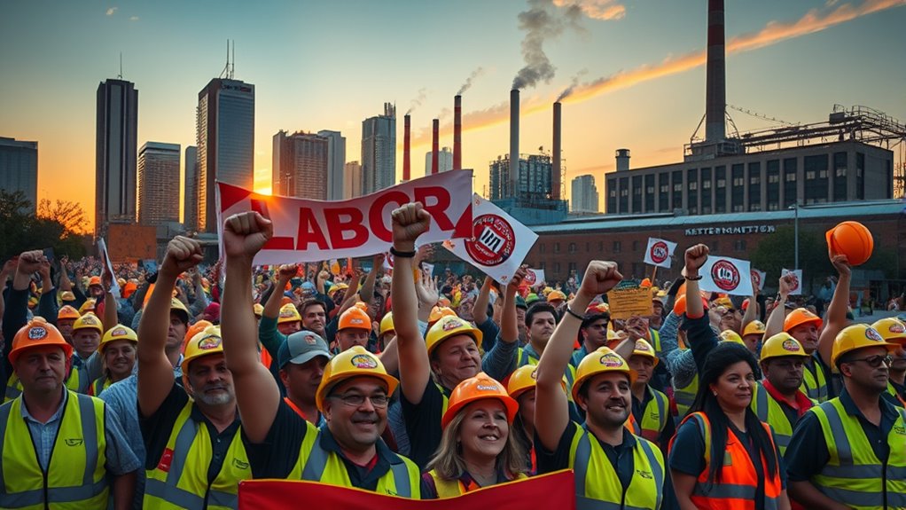In 2025, you see a strong financial and social shift as unions surge back, fueled by workers demanding better wages and conditions. Strikes and collective bargaining lead to major wins in pay, safety, and benefits, showing how unity can shape workplace policies. Employers now recognize that a motivated, organized workforce boosts productivity. If you want to understand how this movement is transforming jobs and workplace power, there’s more to explore below.