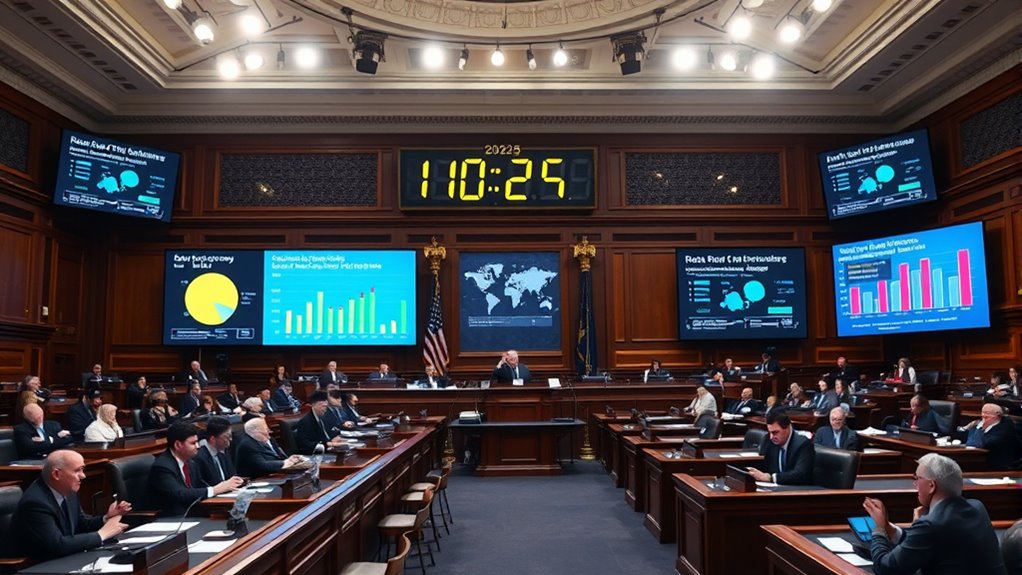 In 2026, the U.S. federal budget focuses on balancing deficit reduction with essential social programs like healthcare, education, and safety nets. Key debates revolve around whether to prioritize spending cuts or revenue increases, especially taxing the wealthy, while protecting vulnerable populations. Discussions also consider the impact of austerity measures versus social investments on economic mobility and stability. To understand how these priorities will shape your future, keep exploring the ongoing fiscal debates and policy choices.