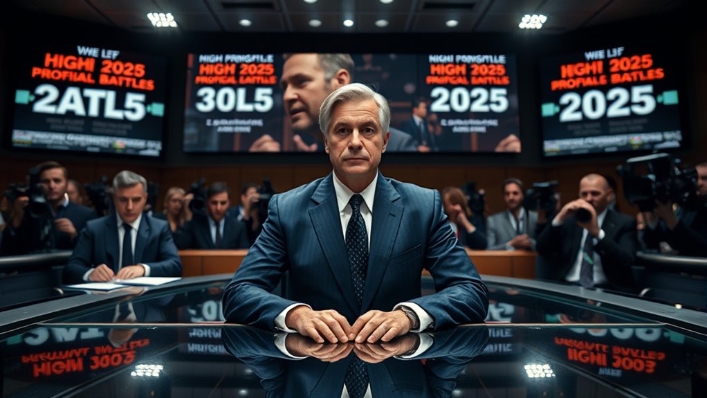 In 2025, celebrity legal battles highlight privacy breaches, contract disputes, and industry power struggles. Many stars sue over leaked private photos and videos, with courts awarding damages that emphasize privacy rights. Contract disputes involve endorsement deals and contractual breaches, often leading to public accusations. Technological advances, like high-resolution evidence, influence case outcomes markedly. To understand these high-profile cases and their repercussions, you’ll discover how legal battles shape celebrity rights and industry standards.