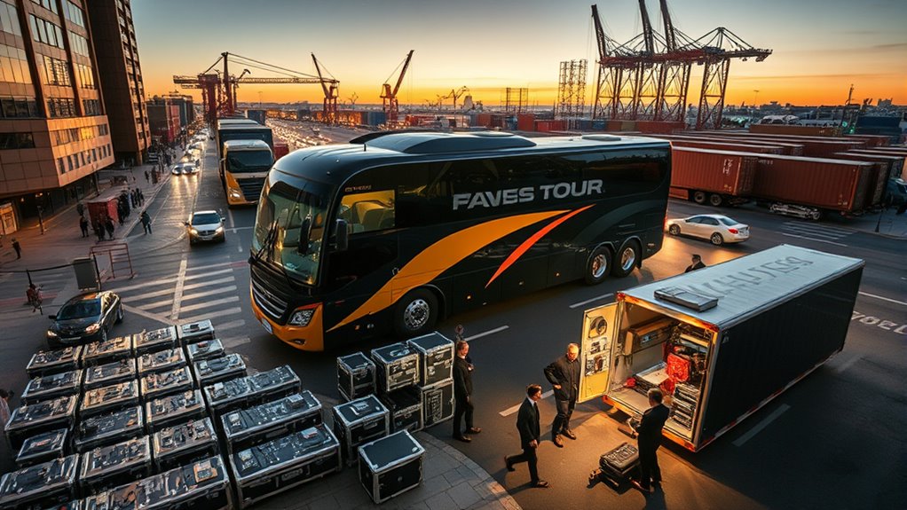 Behind a celebrity world tour, you’ll discover a complex web of logistics working nonstop. From designing quick-build stages and coordinating advanced tech to managing security and transportation, every detail matters. Teams work around the clock to make certain timing, safety, and seamless setup across multiple cities. Clever planning helps avoid delays and mishaps. If you’re curious about what keeps this high-stakes operation running smoothly, keep exploring to uncover the hidden elements behind the scenes.