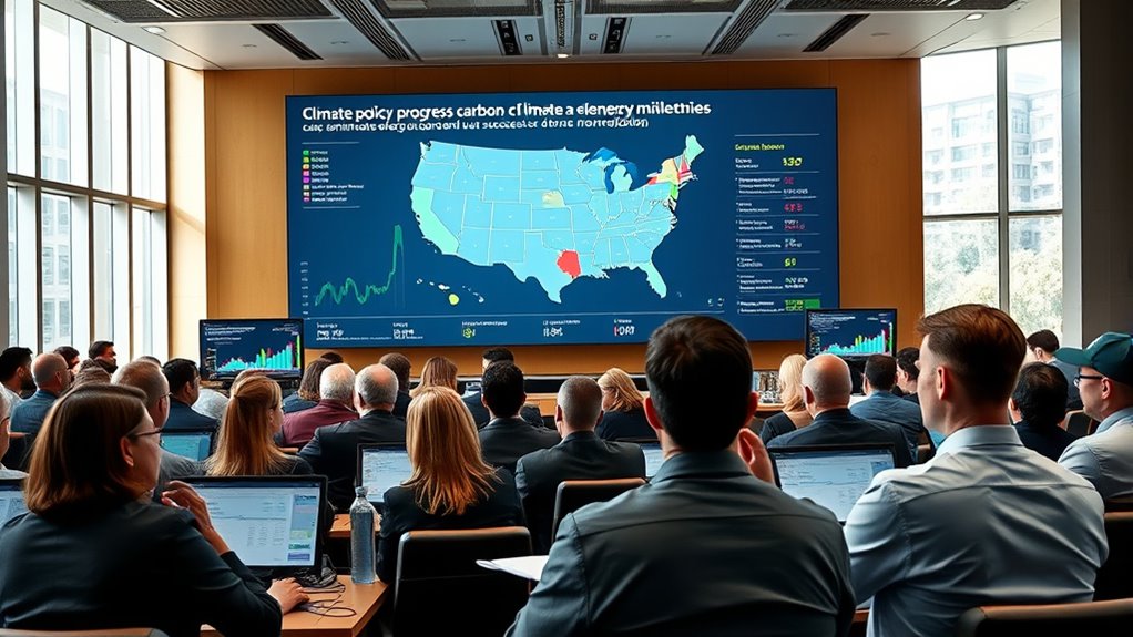 By late 2025, the U.S. has made some progress in expanding renewable energy, investing heavily in solar and wind projects. However, legislative gridlock and political divisions still slow down large-scale climate policies and infrastructure efforts. Regional efforts vary, with states pushing ahead despite federal hurdles. Overall, progress is uneven, and many challenges remain before the country can meet its climate targets. To understand what’s really happening behind the scenes, keep exploring the key factors shaping this complex landscape.