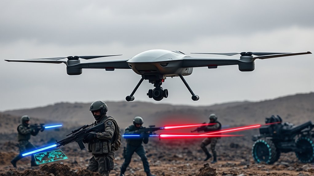 By 2025 and beyond, high-tech warfare will see autonomous drones powered by advanced AI and quantum computing playing a key role on the battlefield. These drones will operate independently, gathering intelligence, executing strikes, and adapting to complex environments in real time. Quantum computing will enhance data security, improve simulations, and analyze vast datasets quickly. As these technologies integrate further, warfare will become faster, smarter, and more precise—continue exploring to understand how these innovations will reshape security strategies.