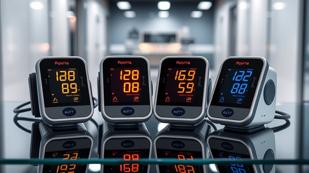 Blood pressure monitors guarantee accuracy by using validated sensors and automatic inflation, reducing user errors. I make sure to sit calmly, keep my arm at heart level, and follow the instructions carefully. Regular calibration and choosing clinically approved devices help maintain precision. I also check the cuff size for a snug fit, which prevents false readings. Consistent techniques and quality monitors give me reliable measurements to track my health effectively.