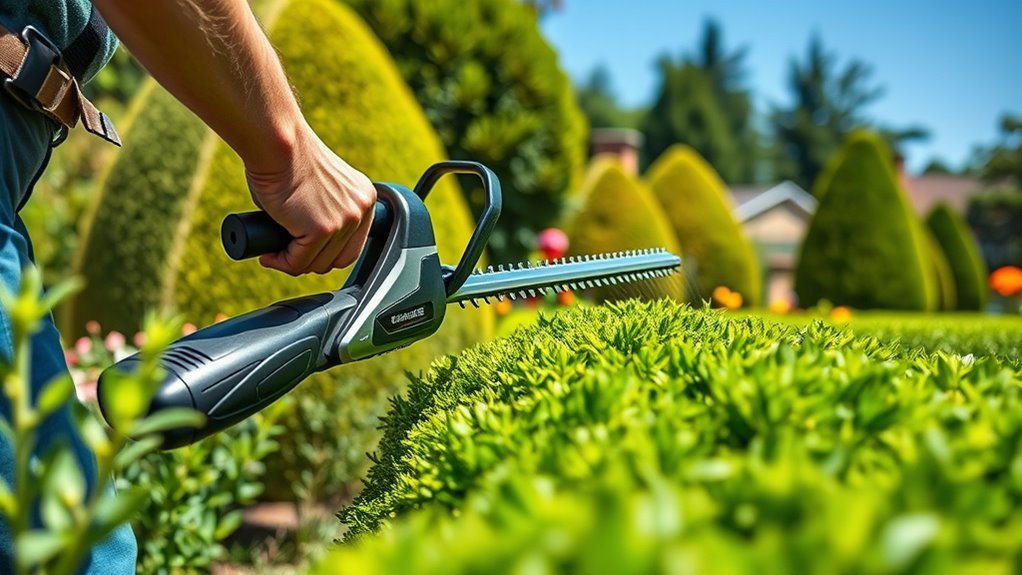If you want to keep your garden neat in 2025, I suggest checking out the top cordless hedge trimmers I’ve found. These models, like the SENIX X6, WORX WG261, and BLACK+DECKER, offer powerful performance, lightweight design, and long runtime, making trimming easy and efficient. Whether you’re dealing with small bushes or thicker hedges, there’s a perfect fit for your needs. Keep going to discover the best options and features to contemplate.