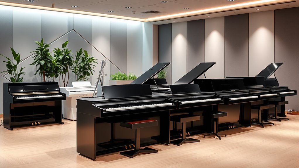 If you’re looking to elevate your musical skills in 2025, I recommend exploring the top 15 digital pianos that combine realistic feel, exceptional sound, and portability. From beginner-friendly models like Yamaha’s 61-key portable keyboard to advanced options with weighted keys and Bluetooth connectivity, there’s something for every skill level. These pianos not only enhance your practice but also inspire creativity. Keep going to discover more about each option and find the perfect fit for your musical journey.