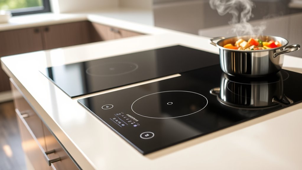 Selecting the right cookware for your induction cooktop is essential for ideal performance and safety. Induction requires ferrous cookware with a magnetic bottom—use a magnet to test compatibility. The minimum cookware diameter is usually around 5 inches; smaller pans won’t heat efficiently. Larger zones only heat the area covered by the pan, so matching the pan size to the zone optimizes heat transfer and prevents energy waste. The shape and material of your cookware also matter—flat-bottom pans work best, while rounded or uneven bottoms reduce efficiency. Choosing appropriately sized cookware ensures even cooking, saves energy, and protects your cooktop and pots from potential damage. Being mindful of these factors helps you get the most out of your induction cooktop’s performance.