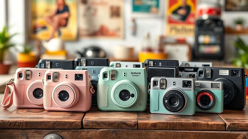 Looking for the best instant film cameras in 2025 to capture classic, vintage-style moments? I recommend models like the Fujifilm Instax Mini 41, Polaroid Now 3rd Gen, and Fujifilm Instax Mini 12, which combine retro design with modern features. These cameras are portable, easy to use, and produce vibrant, high-quality prints perfect for spontaneous shots. If you want to explore more options and details on choosing the right cam, keep going.