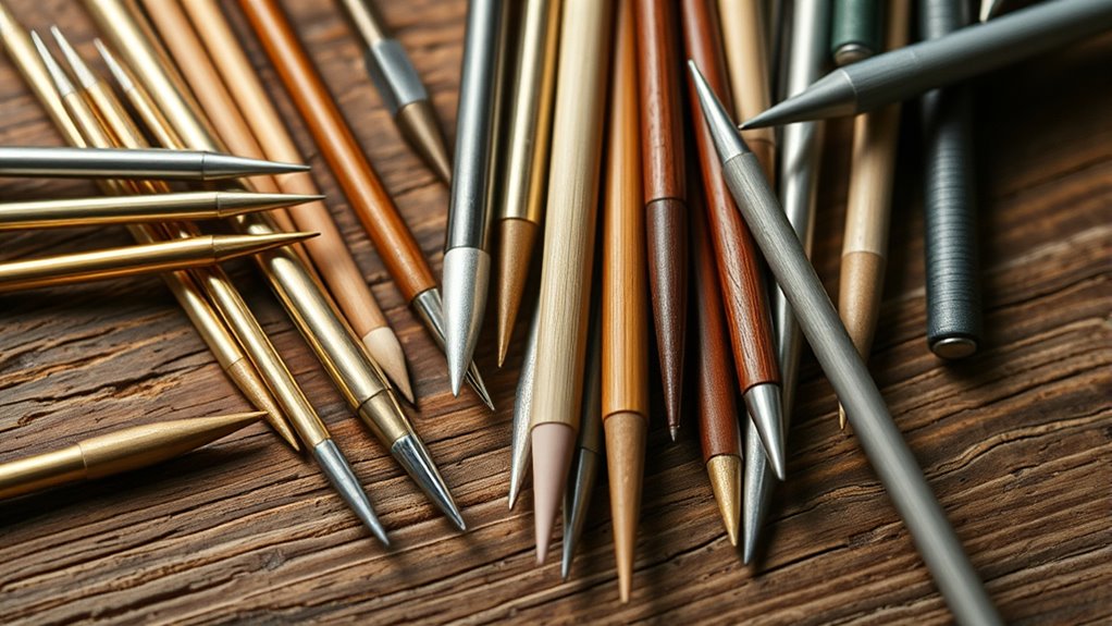 Choosing the right knitting needle material is essential because it directly impacts how comfortable and efficient your knitting experience will be. Metal needles, like aluminum or stainless steel, are lightweight, sturdy, and let yarn slide smoothly, making them perfect for fast knitting. Wooden or bamboo needles offer a warm, textured grip that helps reduce slipping and hand fatigue, especially during long sessions. Plastic or acrylic needles are usually lightweight and budget-friendly but might not be as durable or smooth as metal or wood. The material also affects how well the needles resist rust, splitting, and wear over time, which influences their longevity and performance. Picking the right material helps guarantee your knitting is comfortable, enjoyable, and efficient over the long run.