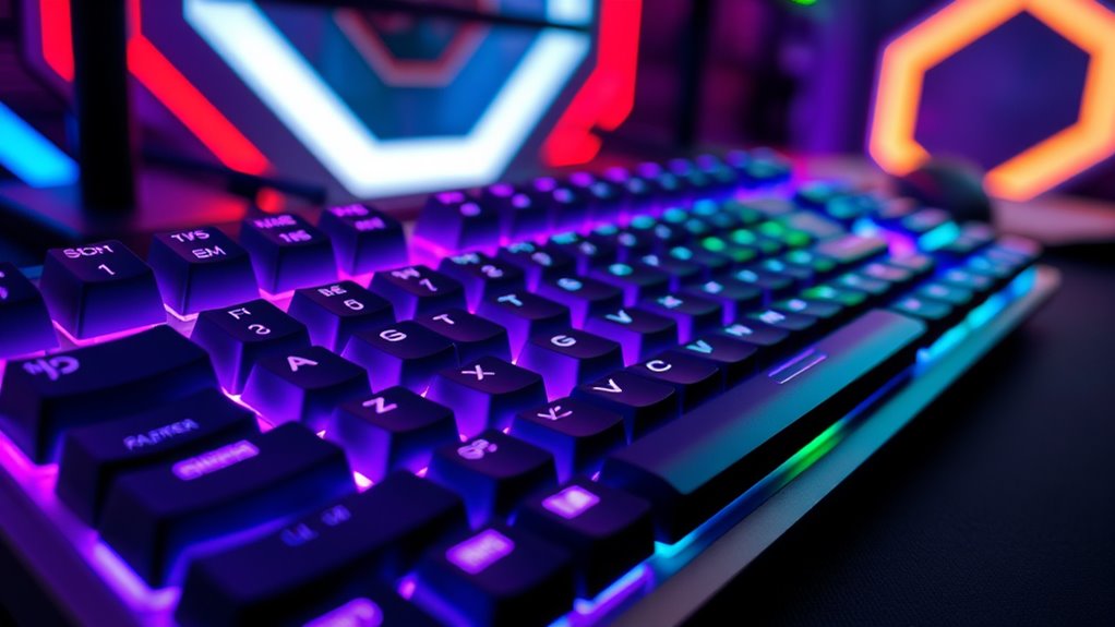 Backlighting customization lets you tailor your keyboard’s appearance to match your setup or mood, adding both style and functionality. With options like multiple colors, effects, and brightness levels, you can create a personalized look that enhances your gaming environment. Many mechanical gaming keyboards support per-key RGB lighting, allowing individual keys to display different colors for dynamic visual effects. Advanced features like adjustable wave effects, reactive lighting, and flow speed give you even more control. Most keyboards include software or onboard controls to save multiple lighting profiles, switch modes easily, and synchronize with other peripherals. While preset modes are common, true customization depends on software that offers extensive color and effect options, enabling you to craft a truly unique lighting setup.