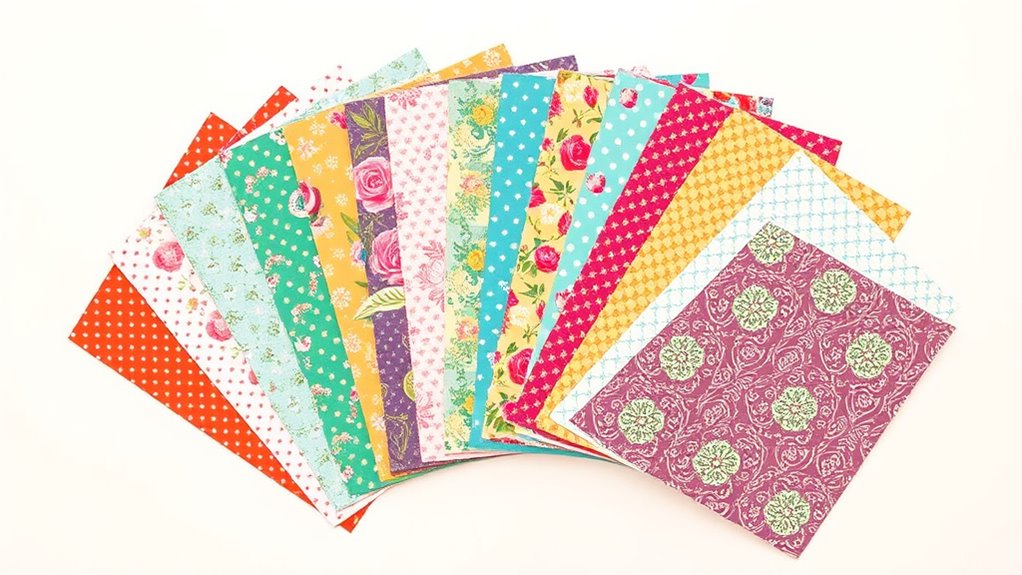 Choosing the right scrapbooking paper pack means considering a variety of pattern options that can enhance your creative possibilities. I look for a mix of floral, geometric, vintage, and abstract designs to keep my projects fresh and interesting. Having both double-sided and single-sided sheets with diverse motifs allows me to layer and add depth easily. I also pay attention to color schemes, from pastels to bold hues, so I can match different themes and moods. Incorporating small, medium, and large patterns adds visual interest and balance to my layouts. Ultimately, a variety of styles ensures I can experiment with techniques like collaging, layering, and journaling backgrounds without feeling limited. Pattern variety truly opens up endless creative opportunities.