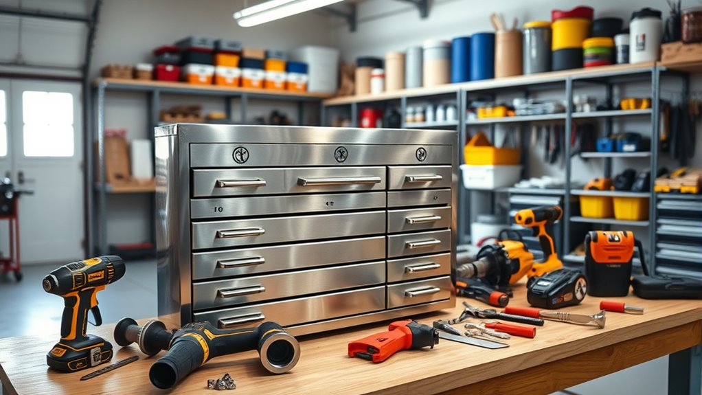If you’re looking to organize your workshop like a pro in 2025, I recommend exploring the top tool chests that combine durability, ample storage, mobility, and security. From heavy-duty steel units with multiple drawers to versatile portable carts, there’s a perfect fit for every workspace and need. These options help keep tools accessible and protected, whether indoors or outdoors. Keep going, and you’ll uncover the top picks and key factors to contemplate for your ideal tool storage setup.