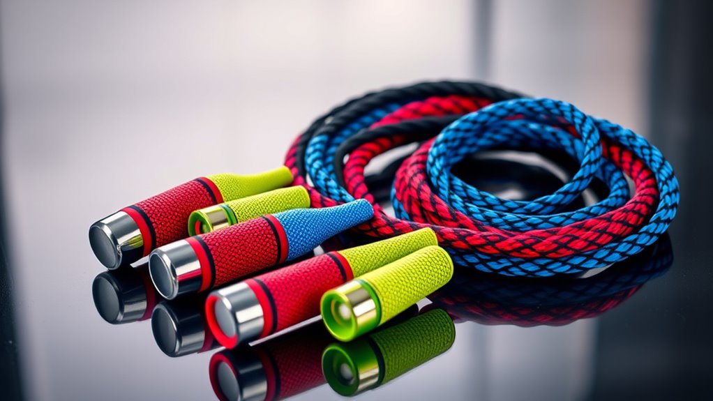 Selecting jump rope handles with ergonomic grips or silicone covers can particularly enhance comfort and prevent hand fatigue during extended workouts. Handles made from durable materials like aluminum or stainless steel offer a secure grip and long-lasting performance, even with intense use. A handle diameter around 26mm provides better grip stability and control, especially during high-speed or complex tricks. Built-in ball bearings in the handles promote smooth rotation, reducing hand strain and boosting workout efficiency. Additionally, textured or rubberized handles help prevent slipping when hands get sweaty, ensuring a firm grip throughout your session. Prioritizing handle comfort and grip can make your jump rope sessions more enjoyable, effective, and safe, helping you stay focused and motivated during every workout.