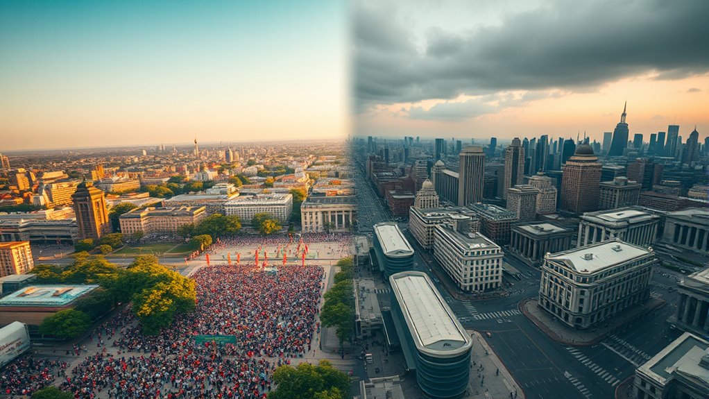 Think of democracy as a delicate bridge that can wobble under the weight of economic inequality. When wealth disparity grows, it fuels political polarization, making it harder for people to unite. This weakens democratic resilience, causing trust to crumble and institutions to strain. You might notice that in such times, the very foundation of democracy shakes, risking collapse if disparities aren’t addressed. Addressing wealth disparity strengthens this essential bridge, ensuring democracy’s survival.